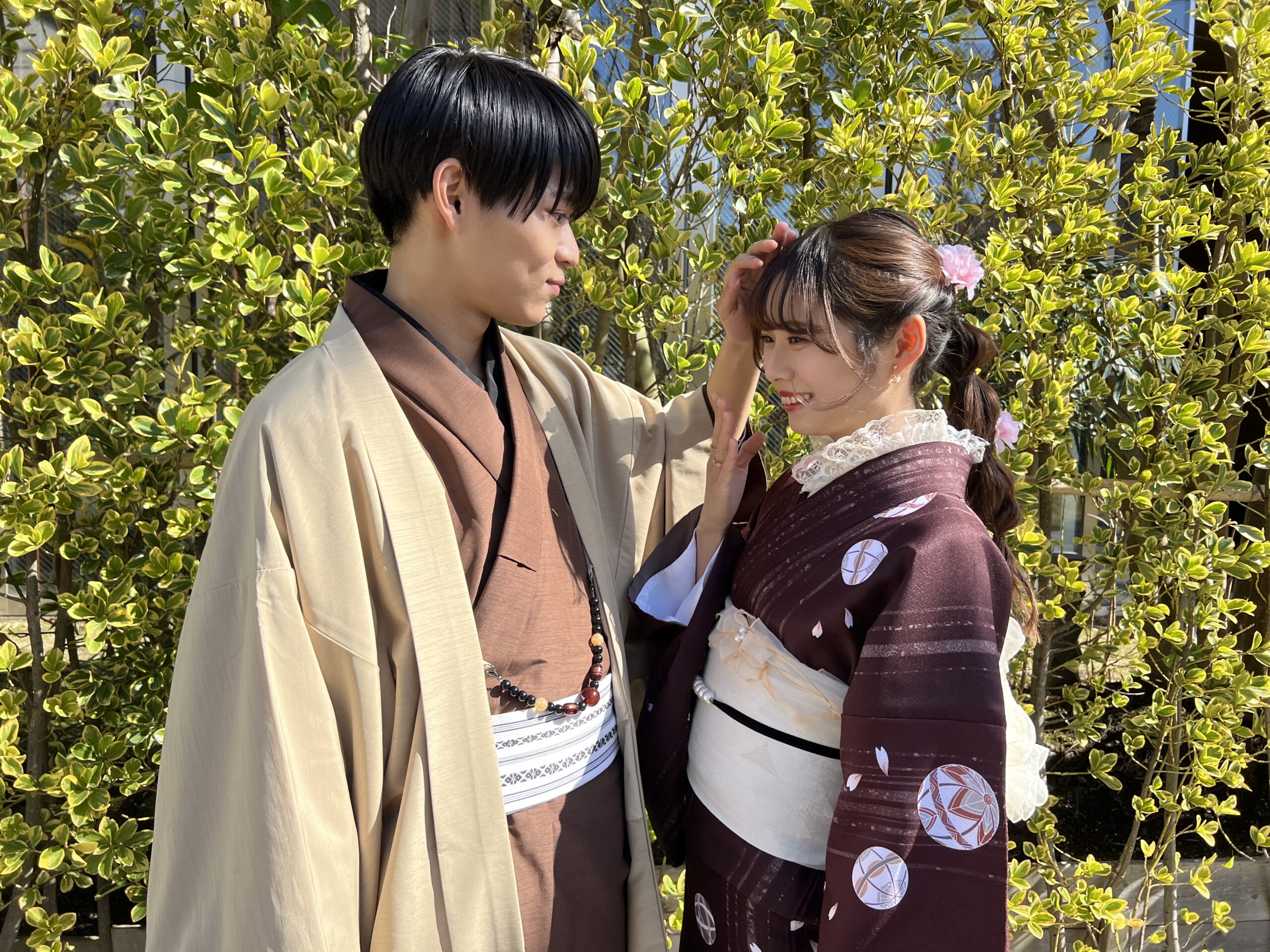 ブラウン×ベージュの組み合わせは、浅草の街並みにも相性抜群。彼は柔らかい色の羽織でこなれ感を、彼女はレースインナーや淡い帯で可憐さを引き出して、同系色でもメリハリが生まれます。ナチュラルで優しい雰囲気のカップルにぴったりの配色です。