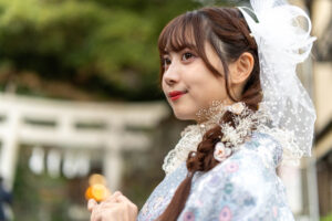 浅草の名所の一つといえば、花やしきです。ここではアトラクションなどを楽しむこともできますが、着物の場合はそういうわけにもいかないので、食べ歩きなどの写真を撮るのがおすすめです。