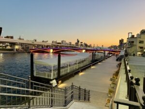 隅田川ほとりの水上バスへ。当店より歩いて3分程度で行ける水上バスの乗り場。浅草周辺を周遊するコースや豊洲まで行けるコースもあって、浅草でも大変人気のアクティビティです。もちろん、着物をレンタルしたお客様も多く乗られているので恥ずかしいなんてこともありません。