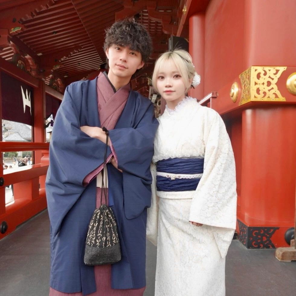 カップル限定の着物レンタルプラン。男女2名様分の着物レンタル一式に着付けと手荷物のお預かりがコミコミ。女性は人気のレース系やレトロ系を含む800種類以上から選べて髪飾り&ヘアセット付!男性の着物も種類豊富にご用意。カップルの浅草着物デートにおすすめなプラン.